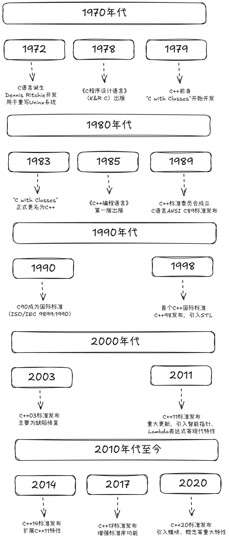 C++ 起源于 20 世纪 80 年代,由同样在贝尔实验室工作的 Bjarne Stroustrup 在 C 语言基础上扩展而成,最初名为 “C with Classes”,旨在解决 C 语言在大型程序开发中抽象能力不足、维护成本高的问题。C++ 在保留 C 高性能和底层控制能力的同时,引入了面向对象、泛型编程和丰富的标准库,并通过持续的标准演进发展为一种既适合底层系统又能支撑大型复杂工程的多范式语言。