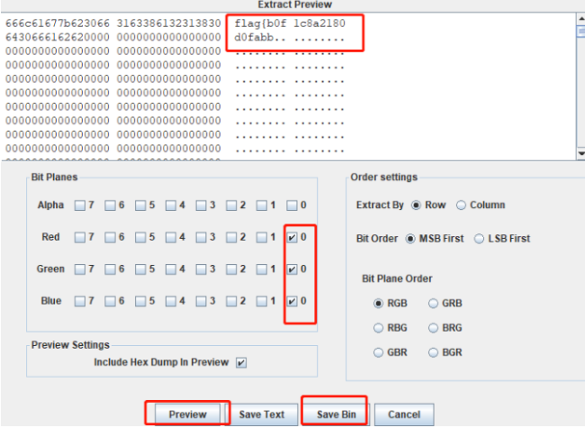 对于LSB隐写的图片,我们用StegSolve打开模块,由于是RGB三原色的最低位隐写,所以在Data Extract模,提取Red,Green,和Blue的0通道信息,在这三个颜色的0通道上打勾,并按下Preview键,当隐写的内容为文本文件时如下所示: