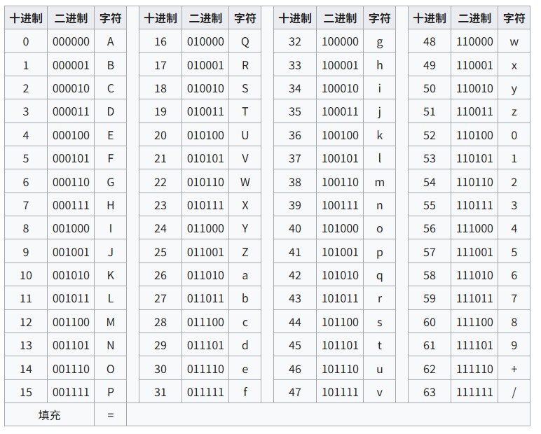 Base64是一种基于64个可打印字符来表示二进制数据的表示方法。由于\(\log_{2}64=6\),所以每6个比特为一个单元,对应某个可打印字符。3个字节相当于24个比特,对应于4个Base64单元,即3个字节可由4个可打印字符来表示。在Base64中的可打印字符包括字母A-Z、a-z、数字0-9,这样共有62个字符,此外两个可打印符号在不同的系统中而不同。一些如UUencode的其他编码方法,和之后BinHex的版本使用不同的64字符集来代表6个二进制数字,但是不被称为Base64。