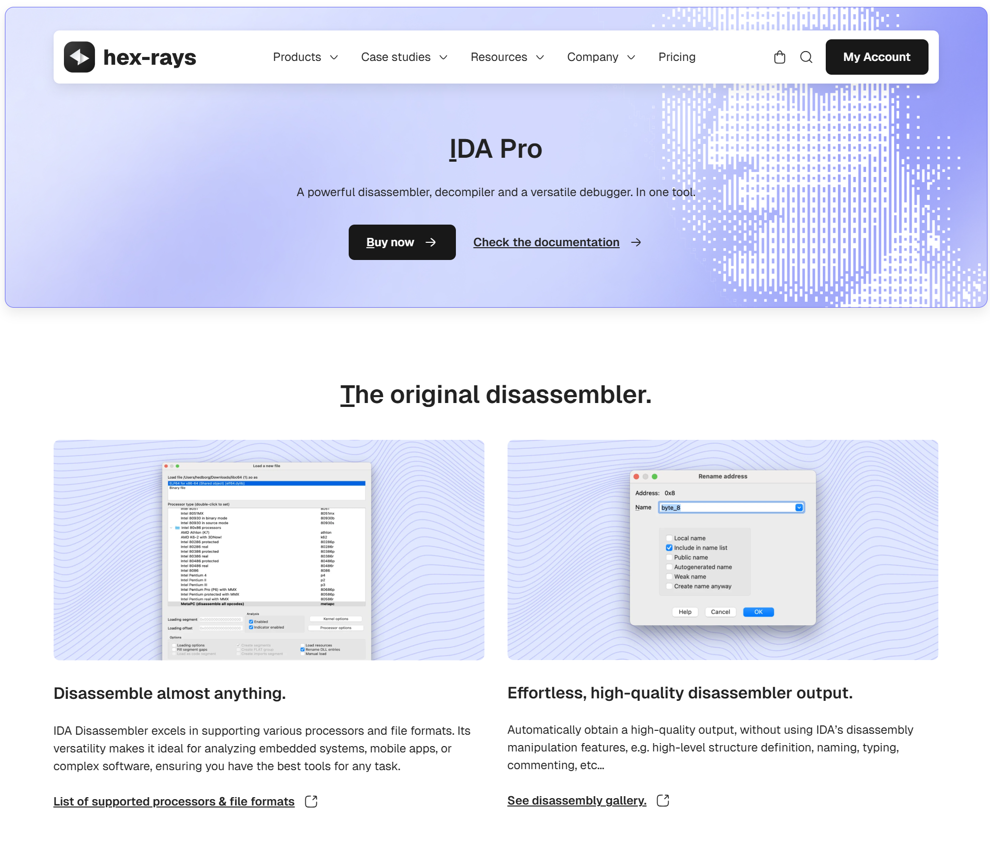 IDA Pro(Interactive DisAssembler Professional)是由 Hex-Rays 公司开发的一款交互式反汇编与逆向分析工具,也是目前软件逆向工程领域应用最广泛的静态分析平台之一。它能够将二进制程序反汇编为汇编代码,并提供丰富的交互功能,帮助研究人员理解程序结构、分析逻辑流程和识别关键功能模块。