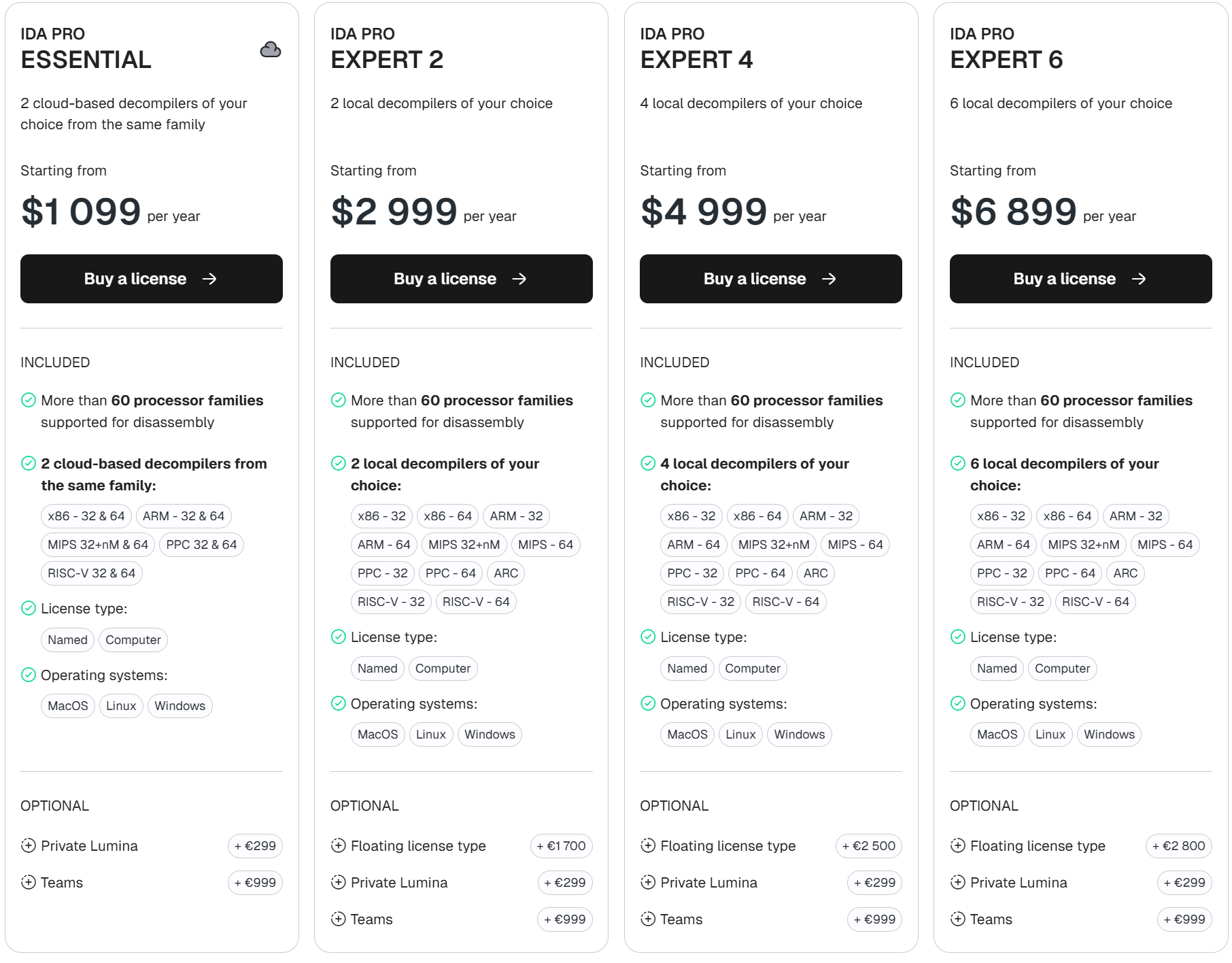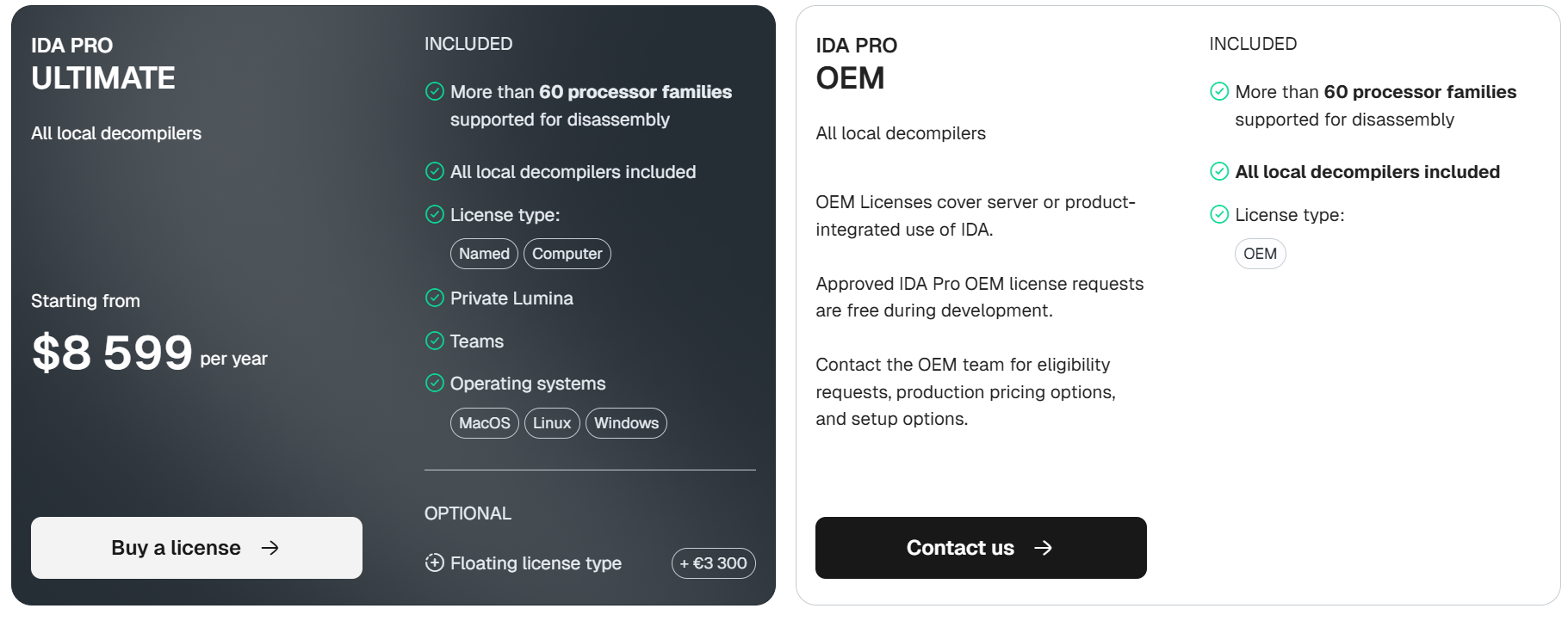 需要注意的是,IDA Pro 属于商业付费软件,其主程序与不同处理器架构的反编译插件分别授权收费。用户需根据自身需求,在 Hex-Rays 官方网站购买相应的许可证后方可合法使用。