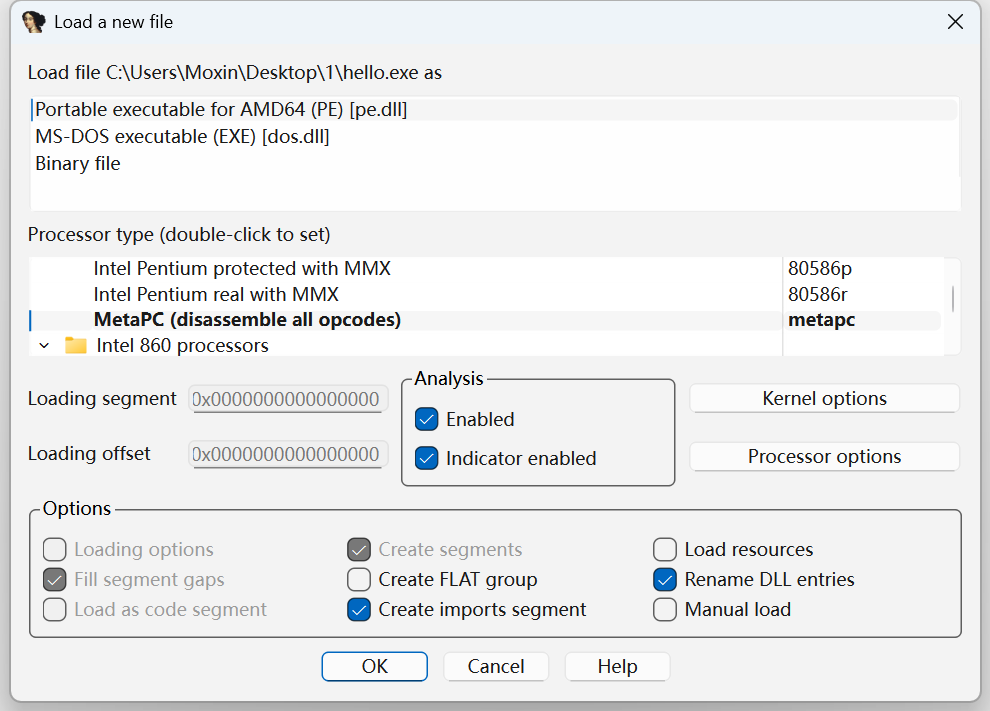 比如该程序,Load file C:\Users\Moxin\Desktop\1\hello.exe as表示位置在C:\Users\Moxin\Desktop\1\hello.exe