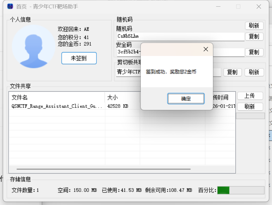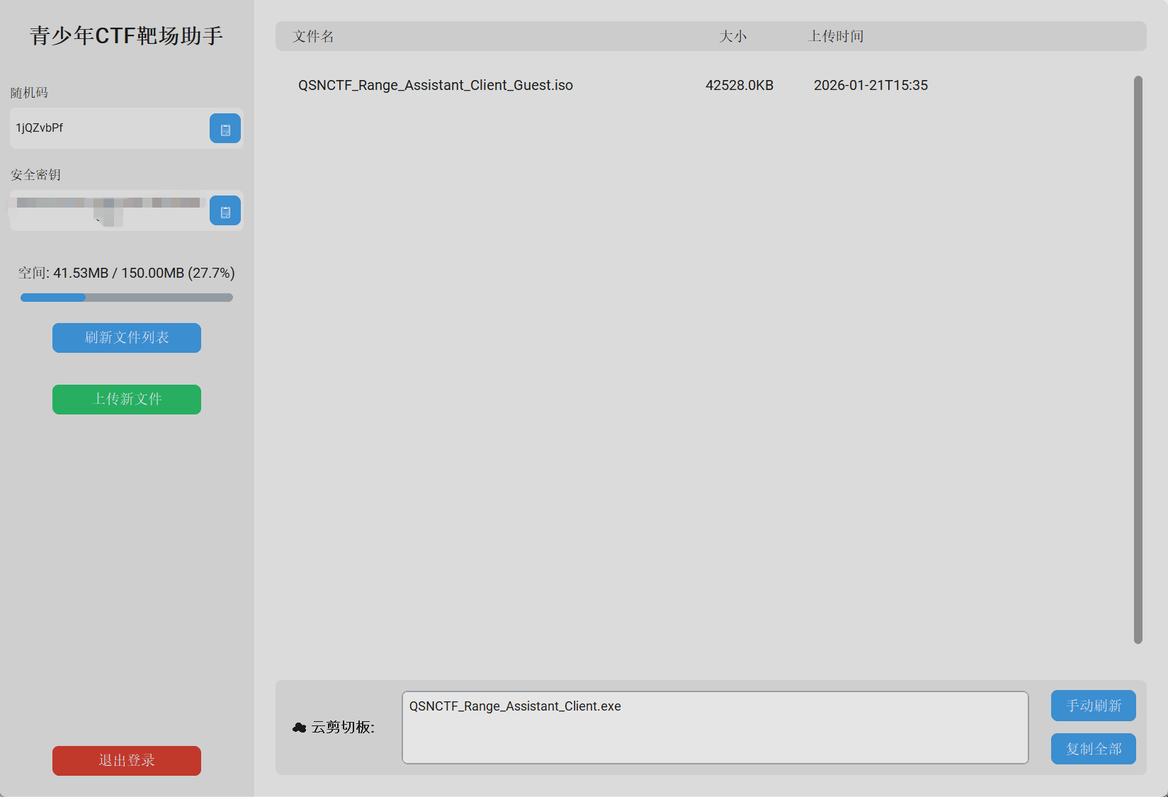 本客户端采用 .NET 框架开发,是一个功能完备的解决方案。它集成了个人签到、动态码(随机码/安全码)展示、跨设备剪切板共享等核心工具,并提供了完整的文件生命周期管理功能,包括上传、下载、存储空间概览。